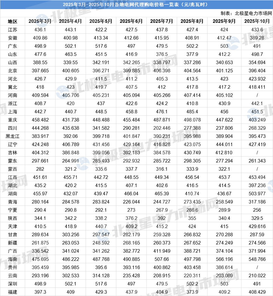 全国各地2025年10月电网企业代理购电价格陆续公布。北极星电力市场网汇总了2025年3月-2025年10月各地电网企业代理购电价格,如下表所示: